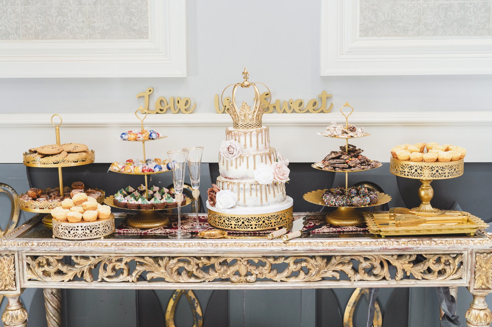 The Regal Dream dessert bar evokes the charm of a Victorian reception, where sweets are displayed with dignity, symmetry, and quiet splendor. Every tier and tray is thoughtfully composed to transform the dessert table into a stately centerpiece worthy of an elegant affair.