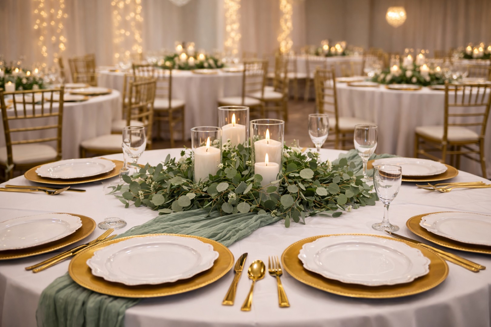 - Bud Vases: For the tables that don’t have garland we can put bud vases with baby’s breath and candles or lanterns.