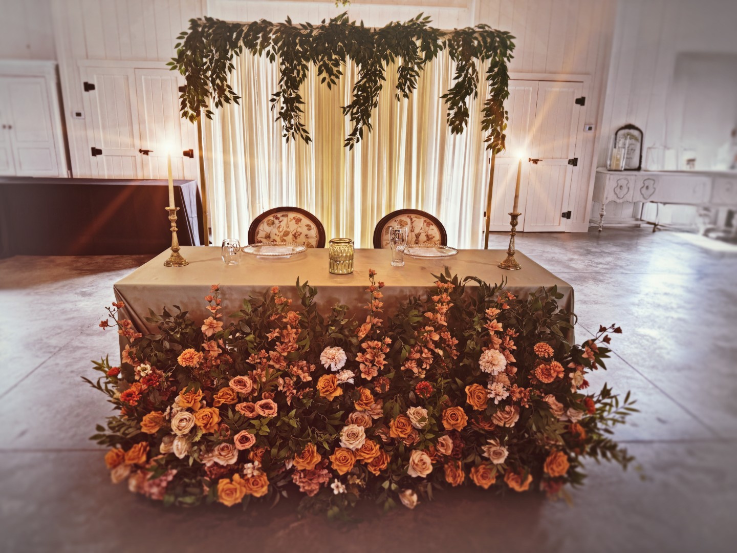 Sunset Serenade is an elegant, earth-toned wedding floral set featuring arbor florals, aisle markers, and a beautifully styled sweetheart table. Its mix of country warmth and upscale detail makes it perfect for nearly any venue or style.