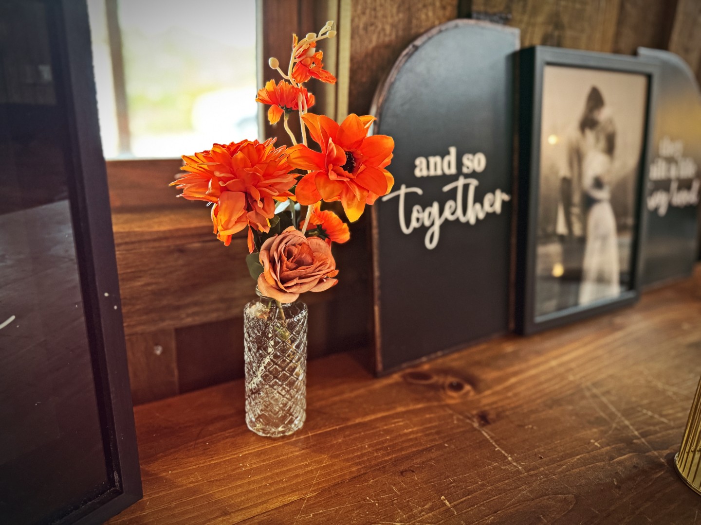 The Intense Devotion Accent Vases add a vibrant touch of color and depth to the smaller spaces throughout your wedding, featuring the same passionate oranges, yellows, reds, and lush greenery found in the main Intense Devotion set. Perfect for dessert tables, gift tables, sign-in areas, or any spot that needs an elegant floral highlight, this optional add-on includes six delicate bud vases filled with bold blooms and two large white vases overflowing with lush, coordinated florals. These accent pieces seamlessly extend the theme of the Intense Devotion set, creating a cohesive and beautifully styled atmosphere across your entire celebration.