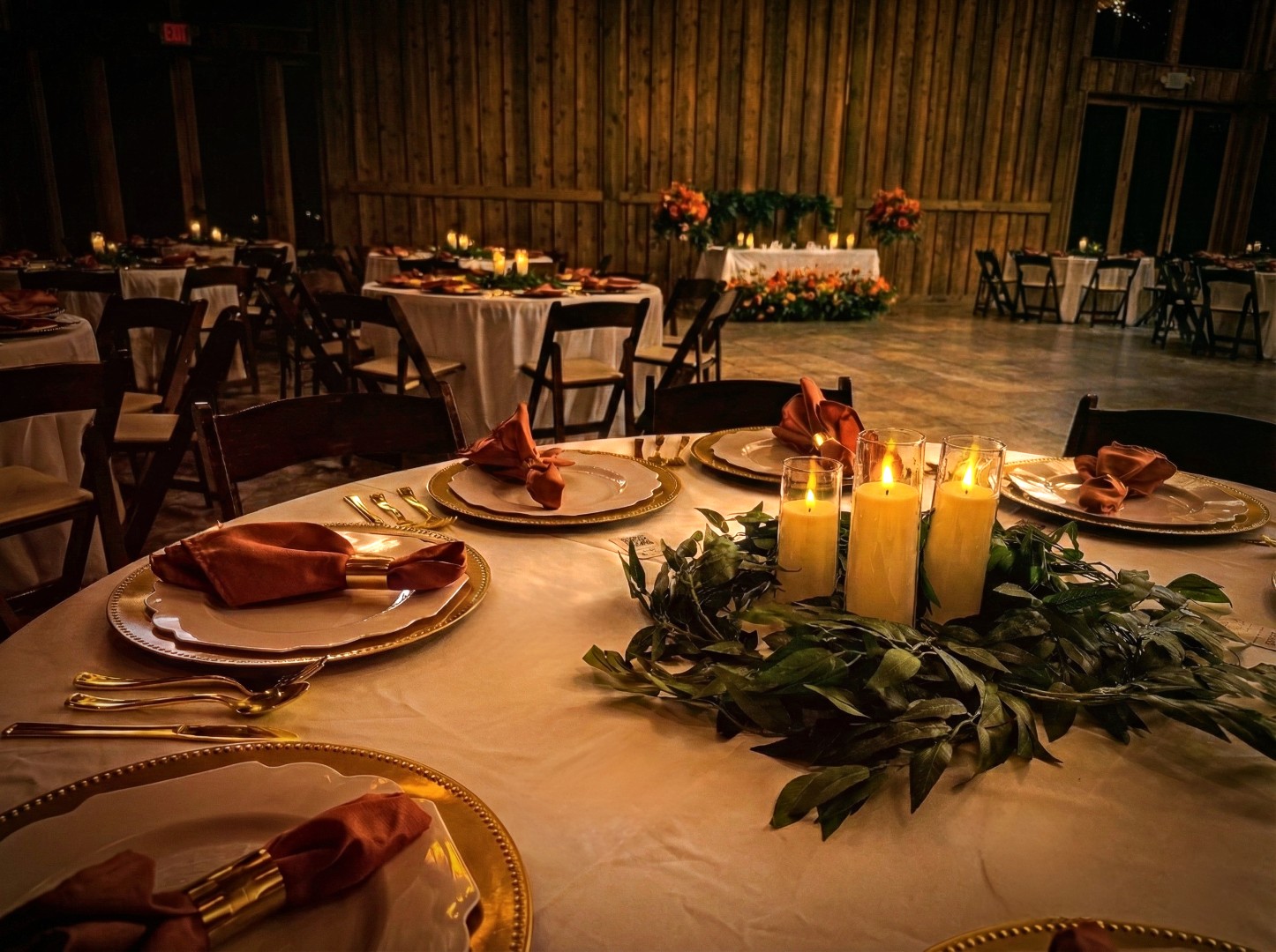 The Intense Devotion Centerpieces are a warm and inviting add-on option featuring three glass pillar LED candles in varying heights, all nestled within a soft, earthy ivy garland. Designed to complement any venue or tablescape, these centerpieces provide a simple yet atmospheric glow that pairs beautifully with the bold florals of the Intense Devotion set. Available as an optional rental at $25 per centerpiece with 15 available, they offer an elegant, budget-friendly way to enhance guest tables while maintaining the cohesive, romantic feel of the overall design.