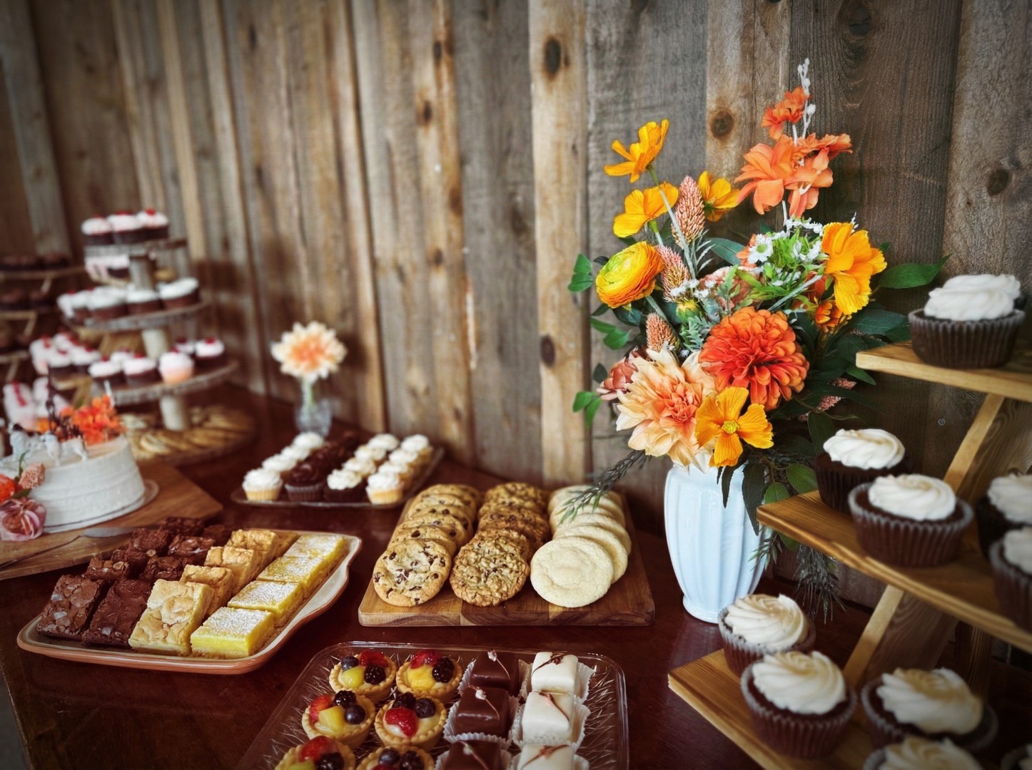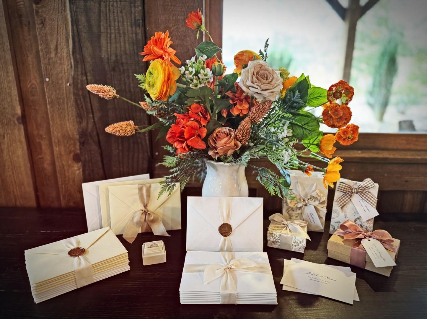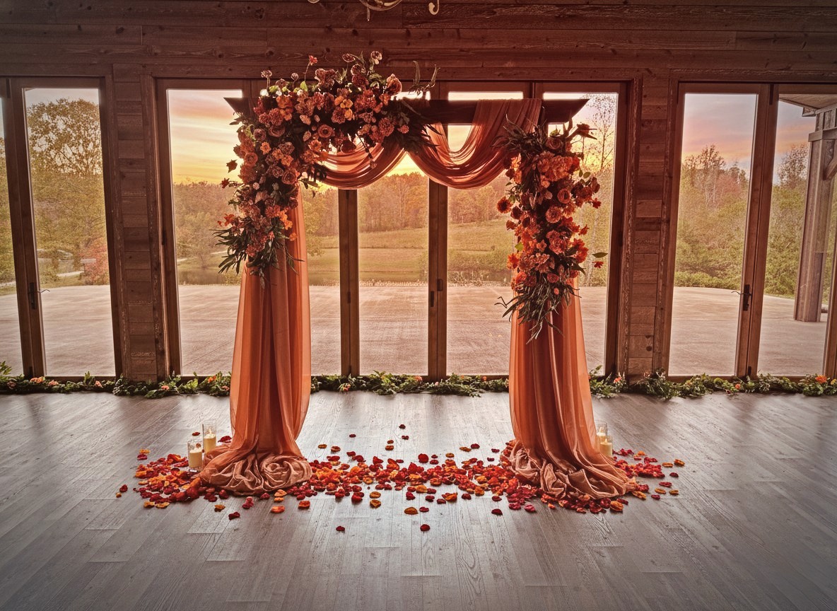The Intense Devotion wedding rental set is crafted for couples who want their décor to radiate emotion, passion, and the unmistakable glow of true love. Featuring a rich palette of oranges, yellows, reds, and lush greenery, the florals in this set are intentionally bold and wild, creating striking arrangements that feel alive and full of movement. A traditional wooden arbor serves as the heart of the ceremony design, complete with flowing drapes and a lush floral spray that frames the couple in unforgettable color. Lined with garlands and candlelit accents, the aisle becomes a warm, glowing path that feels both romantic and deeply timeless.