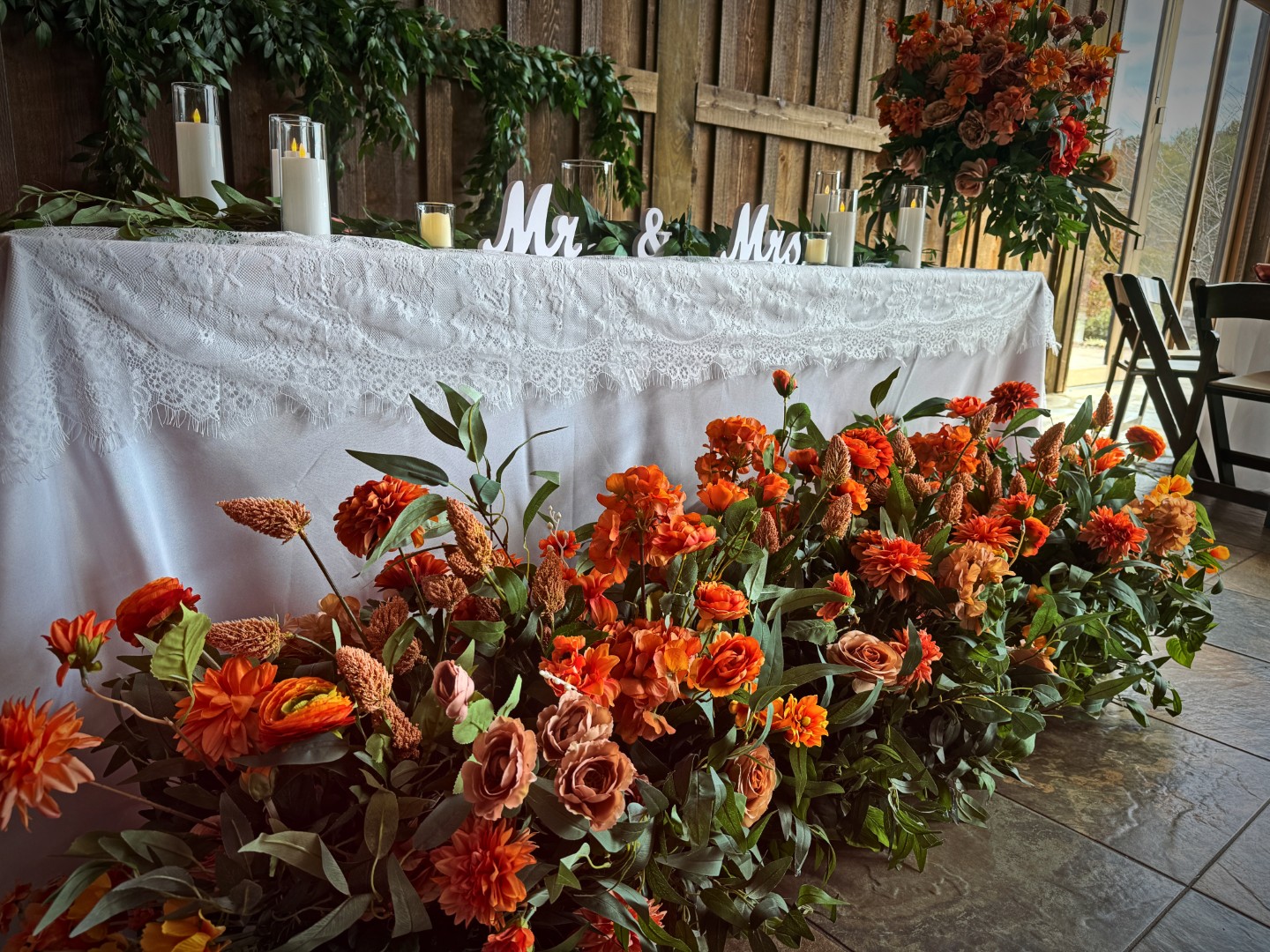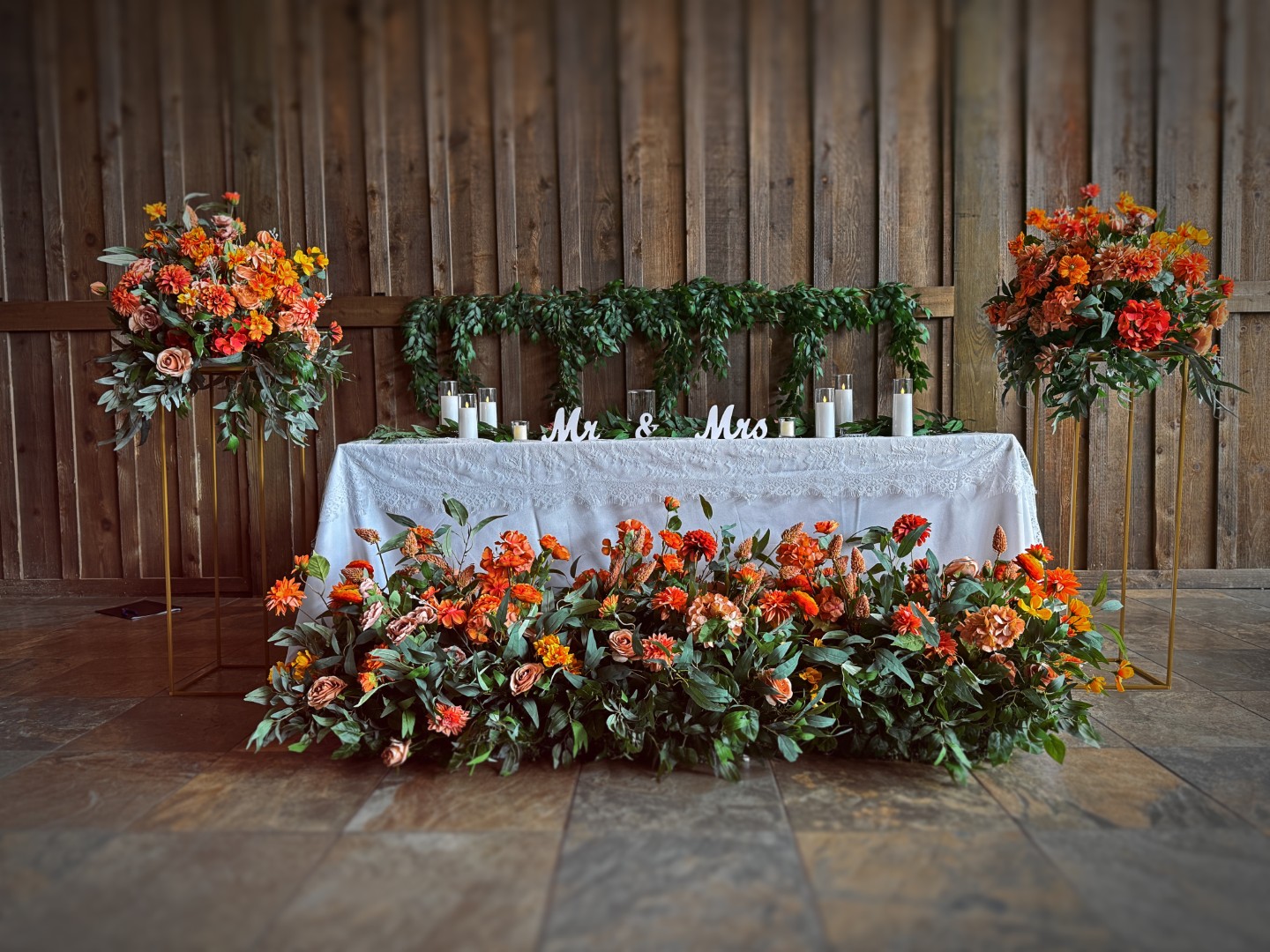 Sweetheart table set which includes large grounded arch for the front of the table, candles and garland for tabletop, and large topper arrangements with pedastols for the sides of the table.