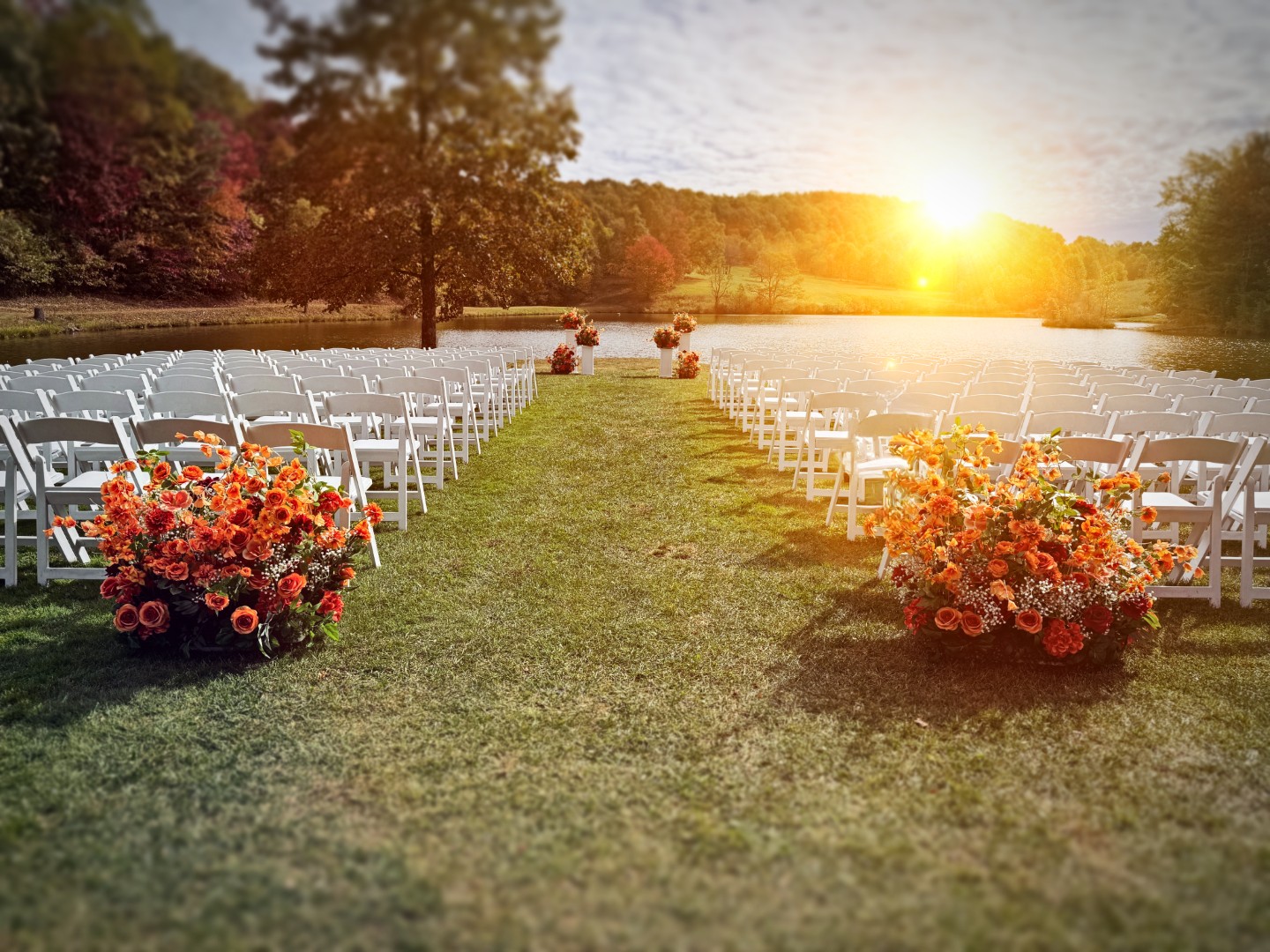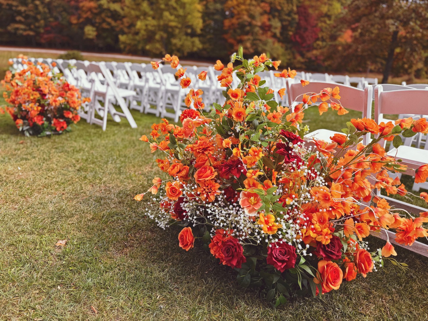12 orange vases with baby’s breath to compliment your ceremonty aisle with a tasteful simplicity.