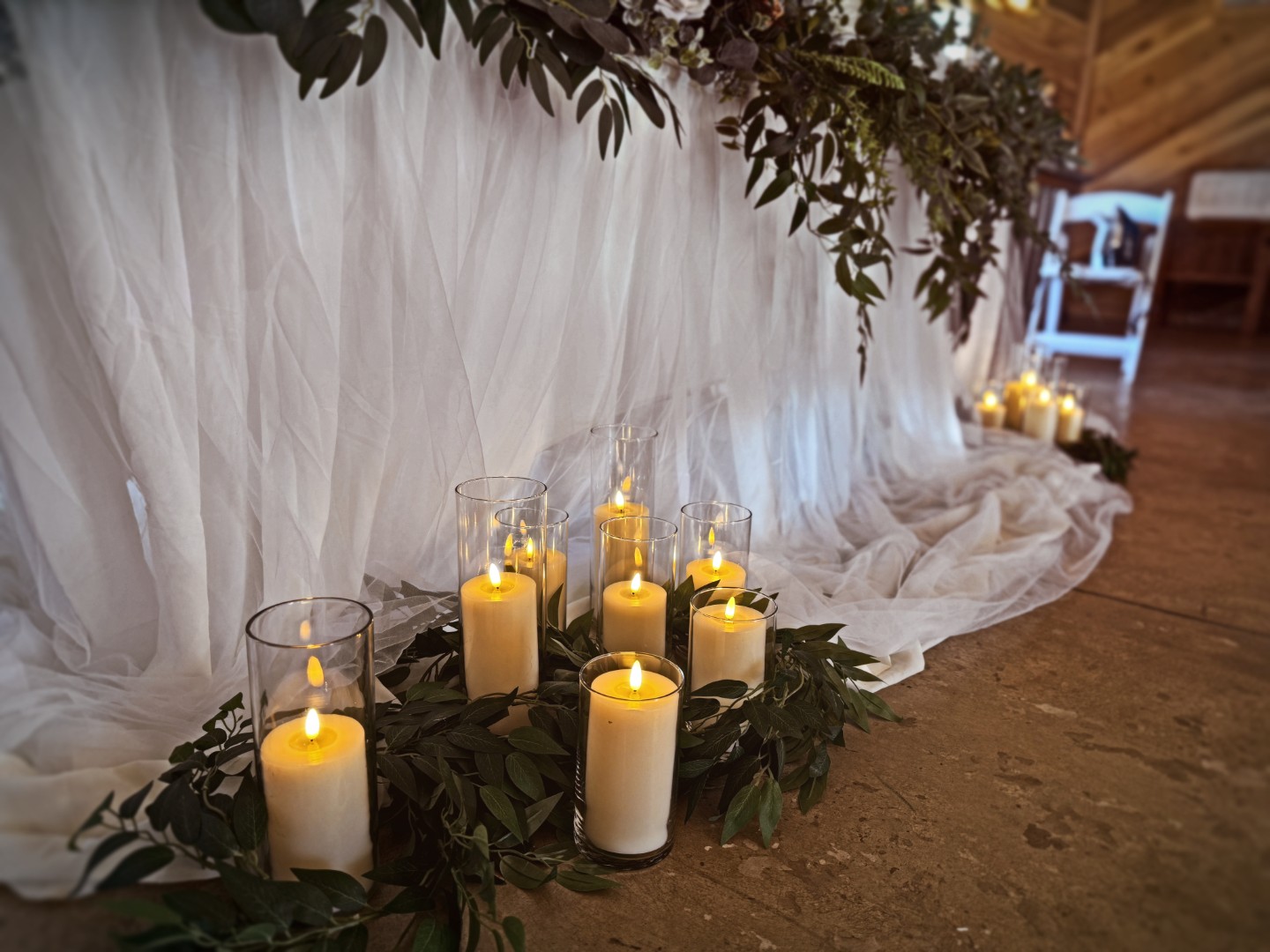 To complete the experience, the set includes a show-stopping sweetheart table arrangement—a full, romantic display featuring lush florals, elegant draping, candles, and layered garlands that transform the couple’s table into the standout moment of the reception.