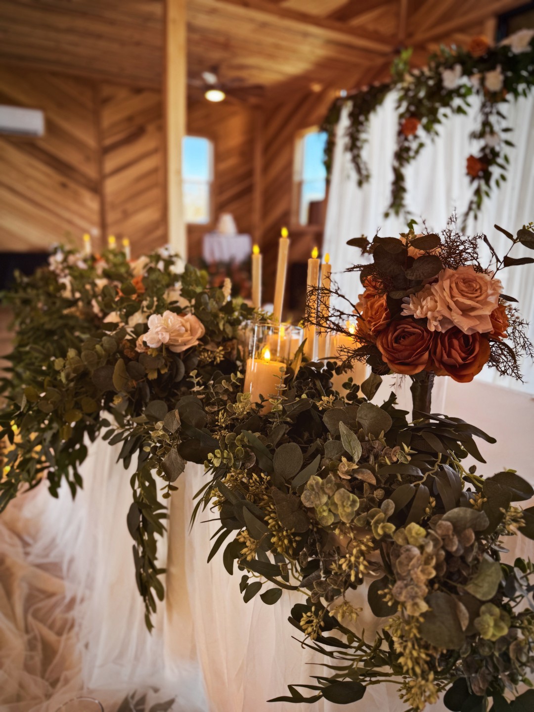 Sweetheart table set which includes large, lush floral table arrangement, draping, candles, and garland.