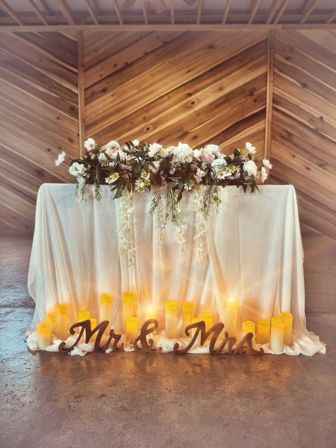 Twenty LED candles with batteries, draping for the table and a 35″ table flower arrangement with hanging vines.