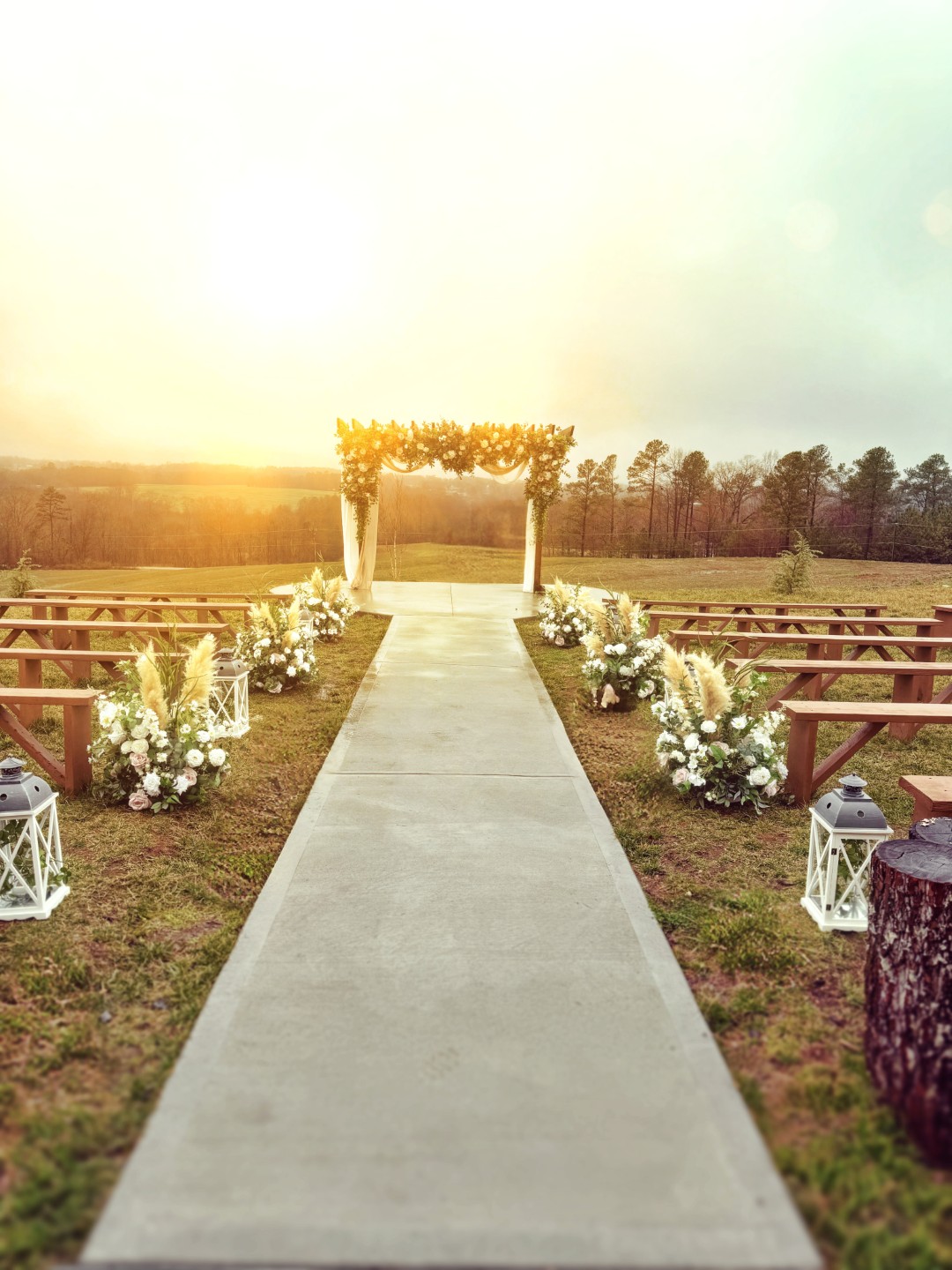 To take it a step further, add-ons are available combining all from the base package with thoughtfully selected decorative pieces that complete the look. These include a “Mr. & Mrs.” sign, centerpiece sets (wood rounds, wood lanterns, candles, greenery, and cheese cloth), wood plate chargers, 2 pampas-filled vases, a rustic wood cake stand, a white chest, a honeymoon fund box, “Love is Sweet” and “Heaven” signs, 2 reserved table signs, 2 white wood easels, and two large barrel arrangements and more. Delivery, setup, and same-day takedown within two hours of Hickory, NC is included. If your venue is a bit further out or you're needing the setup for more than one day, no problem—just know that additional charges will apply. From the moment we arrive to the final pickup, our goal is to make sure everything looks perfect so you can focus on soaking in every moment.