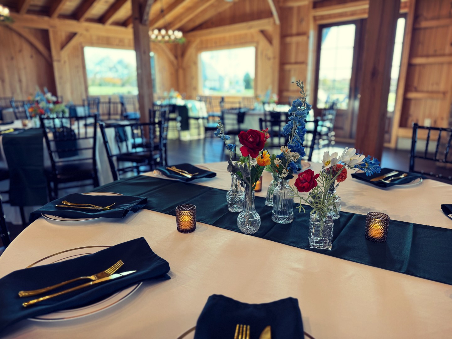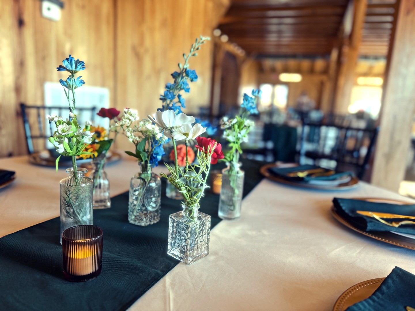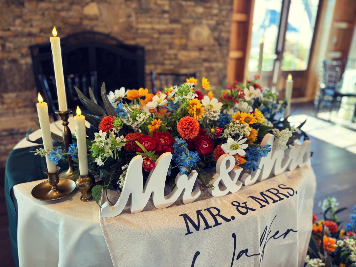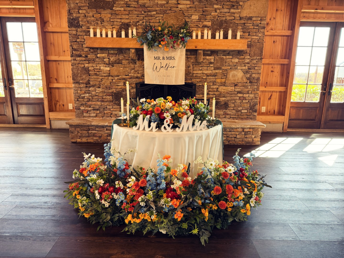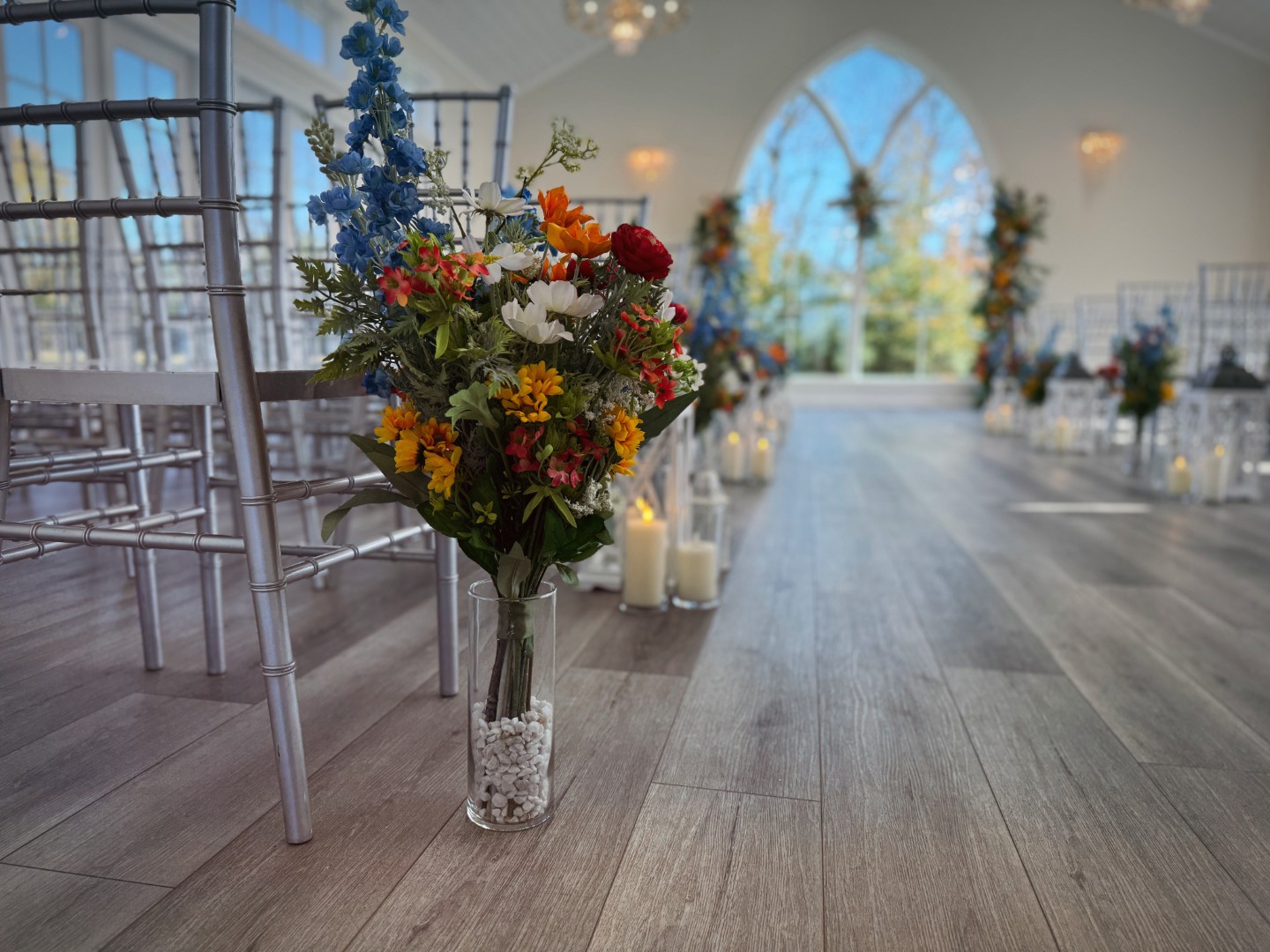 Wild Romance is a vibrant, joy-filled wedding flower and décor rental set designed for couples who want their celebration to feel alive, expressive, and overflowing with color. This set features a breathtaking medley of blues, reds, yellows, oranges, and whites, all artfully blended with lush greenery to create an authentic wildflower feel. The star of the collection is the pair of towering 8-foot floral columns, each wrapped from top to bottom in cascading blooms that feel freshly gathered from a blooming meadow. These columns create an unforgettable altar moment—romantic, bold, and beautifully organic—perfect for ceremonies where the florals do the storytelling.
